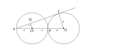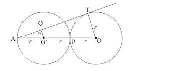 Two circles of same radii r and centres O and O' touch each other at P as shown in Fig. 10.91. If O O' is produced to meet the cirele C (O', r) at A and AT is a tangent to the circle C (O,r) such that O'Q