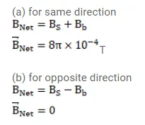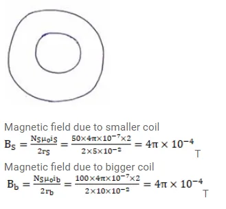 Two circular coils of radii $5.0 \mathrm{~cm}$ and $10 \mathrm{~cm}$ carry equal currents of $2.0 \mathrm{~A}$. The coils have 50 and 100 turns respectively and are placed in such a way that their planes as well as the centers coincide. Find the magnitude of the magnetic field B at the common center of the coils if the currents in the coils are