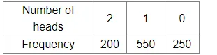 $\therefore P($ Getting at most one head $)=\frac{\text { Number of times of getting at most one head }}{\text { Total number of times two coins are tossed }}=\frac{800}{1000}=\frac{4}{5}$