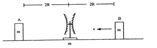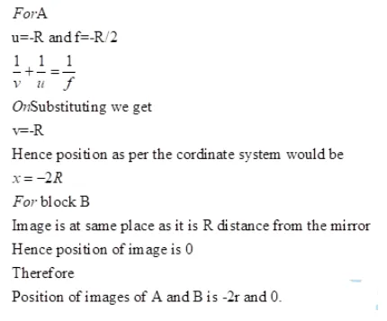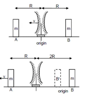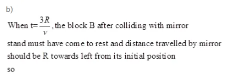Two block $A$ and $B$ each mass $m$, are placed on the two sides of the stand $A t d=0$, the separation between $\mathrm{A}$ and the mirror is $2 \mathrm{R}$ and also the separation between $\mathrm{B}$ and the mirror is $2 \mathrm{R}$. The block B moves towards the mirror at a speed v. All collisions which takes place are elastic. Taking the original position of the mirror stand system to be $X=0$ and $X$-axis along $A B$, find the position of the images of $A$ and $B$ at $t=$