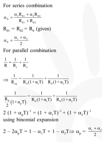 Two conductors have the same resistance at $0^{\circ} \mathrm{C}$ but their temperature coefficients of resistance are $\alpha_{1}$ and $\alpha_{2}$. The respective temperature coefficients of their series and parallel combinations are nearly: