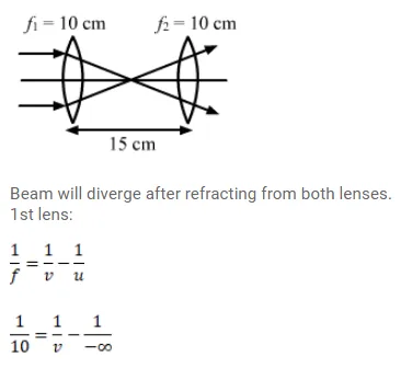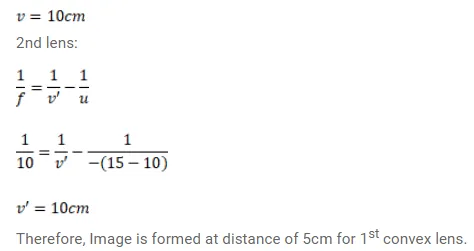 Two convex lenses, each of focal length $10 \mathrm{~cm}$, are placed at a separation of $15 \mathrm{~cm}$ with their principal axes coinciding