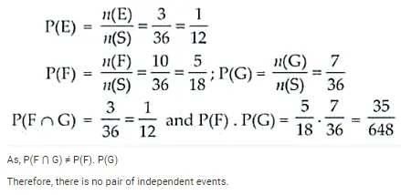 Two dice are thrown together and the total score is noted. The events E, F and G are ‘a total of 4’, ‘a total of 9 or more’, and ‘a total divisible by 5’, respectively. Calculate P(E), P(F) and P(G) and decide which pairs of events, if any, are independent.