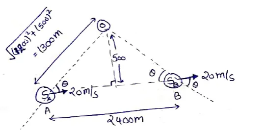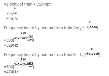 Two electric trains run at the same speed of $72 \mathrm{~km} \mathrm{~h}^{-1}$ along the same track and in the same direction with separation of $2.4$ $\mathrm{km}$ between them. The two trains simultaneously sound brief whistles. A person is situated at a perpendicular distance of $500 \mathrm{~m}$ from the track and is equidistant from the two trains at the instant of the whistling. If both the whistles were at $500 \mathrm{~Hz}$ and the speed of sound in air is $340 \mathrm{~m} \mathrm{~s}^{-1}$, find the frequencies heard by the person.