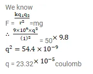 Two equal charges are placed at a separation of $1.0 \mathrm{~m}$. What should be the magnitude of the charges so that the force between them equals the weight of $50 \mathrm{~kg}$ person?