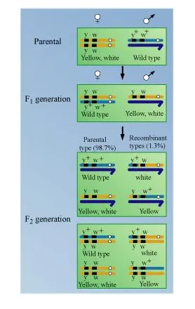 For example, a cross between yellow body and white eyes and wild type parent in a Drosophila will produce wild type and yellow white progenies. It is because yellow bodied and white eyed genes are linked. Therefore, they are inherited together in progenies.
