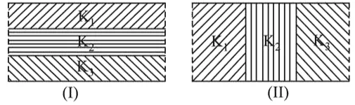 Two identical parallel plate capacitors, of capacitance $C$ each, have plates of area A, separated by a distance $d$. The space between the plates of the two capacitors, is filled with three dielectrics, of equal thickness and dielectric constants $\mathrm{K}_{1}, \mathrm{~K}_{2}$ and $\mathrm{K}_{3}$. The first capacitors is filled as shown in Fig. I, and the second one is filled as shown in Fig. II.