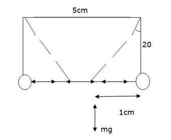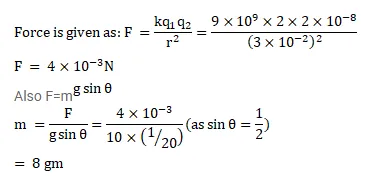 Two identical pith balls are charged by rubbing against each other. They are suspended from a horizontal rod through two strings of length $20 \mathrm{~cm}$ each, the separation between the suspension points being $5 \mathrm{~cm}$. In equilibrium, the separation points between the balls is $3 \mathrm{~cm}$. Find the mass of each ball has a magnitude $2.0 \times 10^{-8} \mathrm{c}$.