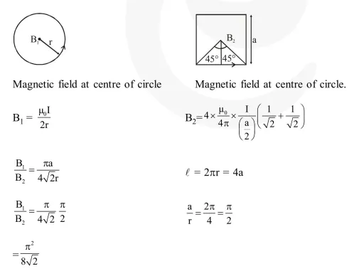 Two identical wires $\mathrm{A}$ and $\mathrm{B}$, each of length ' $T$ ', carry the same current I. Wire $\mathrm{A}$ is bent into a circle of radius $R$ and wire $B$ is bent to form a square of side ' $a$ '. If $B_{A}$ and $B_{B}$ are the values of magnetic field at the centres of the circle and square respectively, then the ratio $\frac{B_{A}}{B_{B}}$ is :