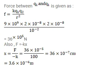 Two identically charged particles are fastened to the two rnds of a spring of spring constant . $100 \mathrm{~N} / \mathrm{m}$ and natural length $10 \mathrm{~cm}$. the system rests on a smooth horizontal table. If the charge on each particle is $2.0 \times 10^{-8} \mathrm{C}$, find the extension in the length of the spring. Assume that the extension is small as compared to the natural length. Justify this assumption after you solve the problem.