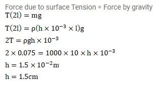 Two larger glass plates are placed vertically and parallel to each other inside a tank of water with separation between the plates equal to $1 \mathrm{~mm}$. find the rise of water in the space between the plates. Surface tension of water $=0.075 \mathrm{~N} / \mathrm{m}$.