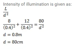 Two light source of intensities 8 cd and 12 cd are placed on the same side of a photometer screen at a distance of $40 \mathrm{~cm}$ from it. Where should a $80 \mathrm{~cd}$ source be placed to balance the illuminance?