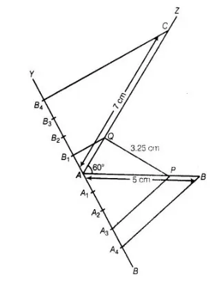 - With A as centre and radius equal to 7 cm draw an arc cutting the line AZ at C.