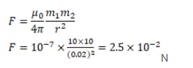 Two long bar magnets are placed with their axes coinciding in such a way that the north pole of the first magnet is $2.0 \mathrm{~cm}$ from the south pole of the second. If both the magnets have a pole strength of 10 A-m, find the force exerted by one magnet on the other.