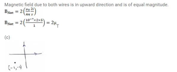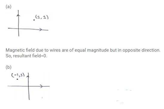 Two long, straight wires, each carrying a current of $5 A$, are placed along the $X$ - and Y-axes respectively. The currents point along the positive directions of the axes. Find the magnetic fields at the points