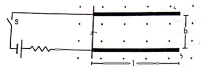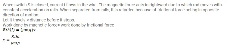 Two metal strips, each of length l, are clamped parallel to each other on a horizontal floor with a separation b between them. A wire of mass $m$ lies on them perpendicularly as shown in figure. A vertically upward magnetic field of strength B exists in the space. The metal strips are smooth but the coefficient of friction between the wire and the floor is $\mu$. A current i is established when the switch $S$ is closed at the instant $t=0$. Discuss the motion of the wire after the switch is closed. How far away from the strips will the wire reach?