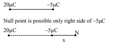 $\mathrm{E}_{\mathrm{N}}=+\frac{\mathrm{k}(-5 \mu \mathrm{C})}{\mathrm{x}^{2}}+\frac{\mathrm{k}(20 \mu \mathrm{C})}{(5+\mathrm{x})^{2}}=0$