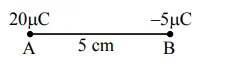 Two particles A and B having charges $20 \mu \mathrm{C}$ and $-5 \mu \mathrm{C}$ respectively are held fixed with a separation of $5 \mathrm{~cm}$. At what position a third charged particle should be placed so that it does not experience a net electric force?