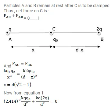 Two particles $\mathrm{A}$ and $\mathrm{B}$ having charges $\mathrm{q}$ and $2 \mathrm{q}$ respectively are placed on a smooth table with a separation d. A third particle $\mathrm{C}$ is to be clamped on the table in such a way that the particles $\mathrm{A}$ and $\mathrm{B}$ remain at rest on the table under electrical forces. What should be the charge on $C$ and where should it be clamped?