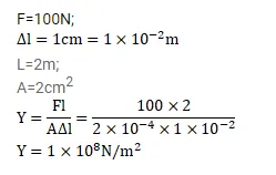 Two persons pull a rope towards themselves. Each person exerts a force of $100 \mathrm{~N}$ on the rope. Find the Young's modulus of the material of the rope if it extends in length by $1 \mathrm{~cm}$. Original length of the rope $=2 \mathrm{~m}$ and the area of cross-section $=2 \mathrm{~cm}{ }^{2}$.
