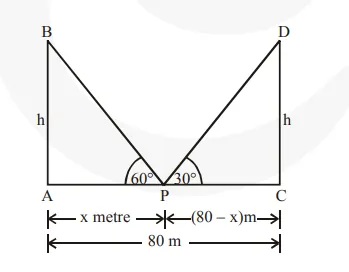 Two poles of equal heights are standing opposite to each other on either side of the road which is 80 m wide. From a point between them on the road, the angles of elevation of the top of the poles are 60° and 30°, respectively. Find the height of the poles and the distances of the point from the poles.