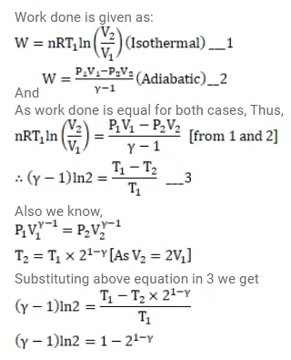 Two samples $A$ and $B$ of the gas have equal volumes and pressures. The gas in sample $A$ is expanded isothermally to double its volume and the gas in $B$ is expanded adiabatically to double its volume. If the work expanded adiabatically to double its volume. If the work done by the gas is the same for the two cases, show that $\gamma_{\text {satisfies the equation }} 1-2^{1-\gamma}=(\gamma-1) \ln 2$