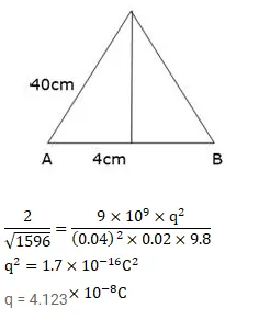 Two small spheres, each having a mass of $20 \mathrm{~g}$, are suspended from a common point by two insulating strings of length $40 \mathrm{~cm}$ each. The spheres are identically charged and the separation between the balls at equilibrium is found to be $4 \mathrm{~cm}$. Find the charge on each sphere.