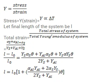 Two steel rods and an aluminium rod of equal length $l_{0}$ and equal cross-section are joined rigidly at their ends as shown in figure below. All the rods are in the state of zero tension at $0^{\circ} \mathrm{C}$. Find the length of the system when the temperature is raised to $\theta$. Coefficient of linear expansion of aluminium and steel are $\alpha_{a}$ and $\alpha_{s}$ respectively. Young's modulus of aluminium is $Y_{a}$ and of steel is $Y_{s}$.