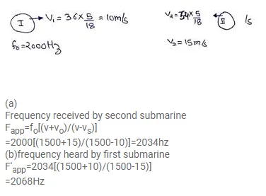 Two submarines are approaching each other in a calm sea. The first submarine travels at a speed of $36 \mathrm{~km} \mathrm{~h}^{-1}$ and the other at $54 \mathrm{~km} \mathrm{~h}^{-1}$ relative to the water. The first submarine sends a sound signal (sound waves in water are also called sonar) at a frequency of $2000 \mathrm{~Hz}$. (a) At what frequency is this signal received from the second submarine. At what frequency is this signal received by the first submarine. Take the speed of the sound wave in water to be $1500 \mathrm{~m} \mathrm{~s}^{-1}$.