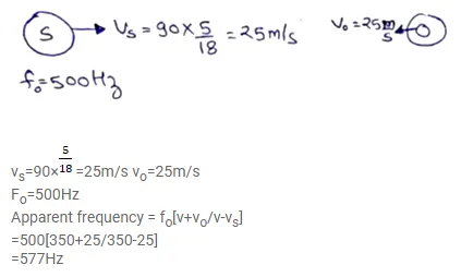 Two trains are travelling towards each other both at a speed of $90 \mathrm{~km} \mathrm{~h}^{-1}$. If one of the trains sounds a whistle at $500 \mathrm{~Hz}$, what will be the apparent frequency heard in the other train? Speed of sound in air $=350 \mathrm{~m} \mathrm{~s}^{-1}$.