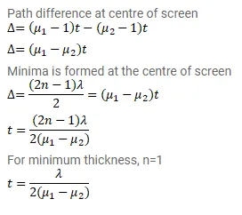 Two transparent slabs having equal thickness but different refractive indices $\mu_{1}$ and $\mu_{2}$ are pasted side by side to form a composite slab. This slab is placed just after the double slit in a Young's experiment so that the light from one slit goes through one material and other slit goes through the other material. What should be the minimum thickness of the slab so that there is a minimum at the point $p_{0}$ which is equidistant from the slits?