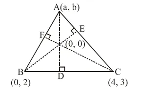 $\mathrm{m}_{\mathrm{BD}} \times \mathrm{m}_{\mathrm{AD}}=-1 \Rightarrow\left(\frac{3-2}{4-0}\right) \times\left(\frac{\mathrm{b}-0}{\mathrm{a}-0}\right)=-1$