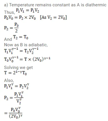 Two vessels $A$ and $B$ of equal $V_{0}$ are connected by a narrow tube which can be closed by a valve. The vessels are fitted with pistons which can be moved to change the volumes. Initially, the valve is open and the vessels contain an ideal gas $\left(C_{p} / C_{v}=\gamma\right)$ at atmospheric pressure $\mathrm{p}_{0}$ and atmospheric temperature $T_{0}$. The walls of the vessel $A$ are diathermic and those of $B$ are adiabatic. The valve is now closed and the pistons are slowly pulled out to increase the volumes of the vessels to double the original value.