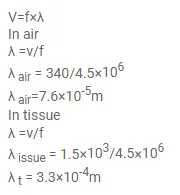 Ultrasonic waves of frequency $4.5 \mathrm{MHz}$ are used to detect tumour in soft tissue. The speed of sound in tissue is $1.5 \mathrm{~km} \mathrm{~s}^{-1}$ and that in air is $340 \mathrm{~m} \mathrm{~s}^{-1}$. Find the wavelength of this ultrasonic wave in air and in tissue.