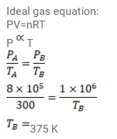 A gas cylinder has walls that can bear a maximum pressure of $1.0^{\times 10^{6}}$ Pa. It contains a gas at $8.0$ $\times 10^{5} \mathrm{~Pa}$ and $300 \mathrm{~K}$. The cylinder is steadily heated. Neglecting any change in the volume, calculate the temperature at which the cylinder will break.