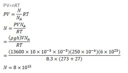 An electric bulb of volume 250 cc was sealed during manufacturing at a pressure of $10^{-3} \mathrm{~mm}$ of mercury at $27^{\circ} \mathrm{C}$. Compute the number of air molecules contained in the bulb. Avogadro constant $=6^{\times} 10^{23}$ per $\mathrm{mol}$, density of mercury $=13600 \mathrm{~kg} / \mathrm{m}^{3}$ and $\mathrm{g}=10 \mathrm{~m} / \mathrm{s}^{2}$.