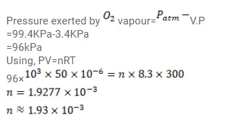 $50 \mathrm{cc}$ of oxygen is collected in an inverted gas jar over water. The atmospheric pressure is $99.4 \mathrm{kPa}$ and the room temperature is $27^{\circ} \mathrm{C}$. The water level in the jar is same as the level outside. The saturation vapour pressure at $27^{\circ} \mathrm{C}$ is $3.4 \mathrm{kPa}$. Calculate the number of moles of oxygen collected in the jar.