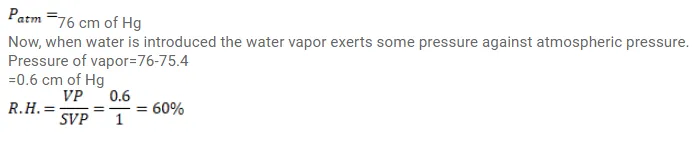 A barometer tube is $80 \mathrm{~cm}$ long (above mercury reservoir). It reads $76 \mathrm{~cm}$ on a particular day. A small amount of water is introduced in the tube and the reading drops to $75.4 \mathrm{~cm}$. Find the relative humidity in the space above the mercury column if the saturation vapor pressure at the room temperature is $1.0 \mathrm{~cm}$.