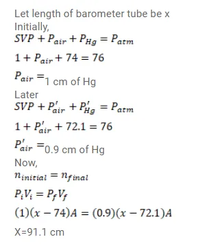 A faulty barometer contains certain amount of air and saturated water vapour. It reads $74.0 \mathrm{~cm}$ when the atmospheric pressure is $76.0 \mathrm{~cm}$ of mercury and reads $72.10 \mathrm{~cm}$ when the atmospheric pressure is $74.0 \mathrm{~cm}$ of mercury. Saturation vapour pressure at the air temperature $=1.0 \mathrm{~cm}$ of mercury. Find the length of the barometer tube above the mercury level in the reservoir.