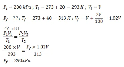 Air is pumped into an automobile tyre's tube upto a pressure of $200 \mathrm{kPa}$ in the morning when the air temperature is $20^{\circ} \mathrm{C}$. During the day the temperature rises to $40^{\circ} \mathrm{C}$ and the tube expands by $2 \%$. Calculate the pressure of the air in the tube at this temperature.