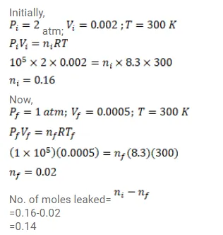 Air is pumped into the tubes of a cycle rickshaw at a pressure of 2 atm. The volume of each tube at this pressure is $0.002^{m^{3}}$. One of the tubes gets punctured and the volume of the tube reduces to $0.0005^{m^{3}}$. How many moles of air have leaked out? Assume that the temperature remains constant at $300 \mathrm{~K}$ and that the air behaves as an ideal gas.