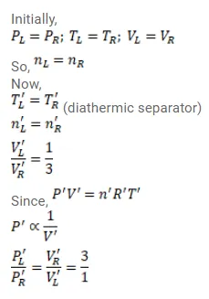 Figure shows a cylindrical tube with adiabatic walls and fitted with a diathermic separator. The separator can be slid in the tube by an external mechanism. An ideal gas is injected in the two sides at equal pressures and equal temperatures. The separator remains in equilibrium at the middle. It is now solid to a position where it divides the tube in the ratio of $1: 3$. Find the ratio of the pressures in the two parts of the vessel.