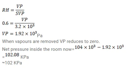 The condition of air in a closed room is described as follows. Temperature $=25^{\circ} \mathrm{C}$, relative humidity $=60 \%$, pressure=104 $\mathrm{kPa}$. If all the water vapour is removed from the room without changing the temperature, what will be the new pressure? The saturation vapour pressure at $25^{\circ} \mathrm{C}=3.2 \mathrm{kPa}$.