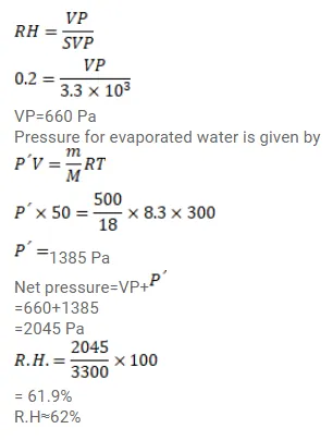 The temperature and relative humidity are $300 \mathrm{~K}$ and $20 \%$ in a room of volume $50 \mathrm{~m}^{3}$. The floor is washed with water, $500 \mathrm{~g}$ of water sticking on the floor. Assuming no communication with the surrounding, find the relative humidity when the floor dries. The changes in temperature and pressure may be neglected. Saturation vapour pressure at $300 \mathrm{~K}=3.3 \mathrm{kPa}$.