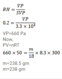 The temperature and relative humidity in a room are $300 \mathrm{~K}$ and $20 \%$ respectively. The volume of the room is $50 \mathrm{~m}^{3}$. The saturation vapour pressure at $300 \mathrm{~K}$ is $3.3 \mathrm{kPa}$. Calculate the mass of the water vapour present in the room.