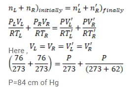 Two glass bulbs of equal volume are connected by a narrow tube and are filled with a gas at $0^{\circ} \mathrm{C}$ at a pressure of $76 \mathrm{~cm}$ of mercury. One of the bulbs is then placed in a water bath maintained at $62^{\circ} \mathrm{C} .$ What is the new value of the pressure inside the bulbs? The volume of the connecting tube is negligible.