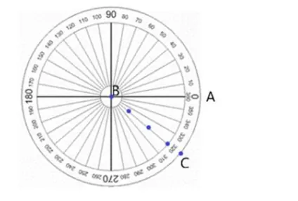 - Place the centre of the protractor at B and the baseline of the protractor along the arm BA.