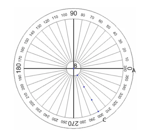 - Find $300^{\circ}$ on the scale and mark a small dot at the edge of the protractor.