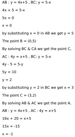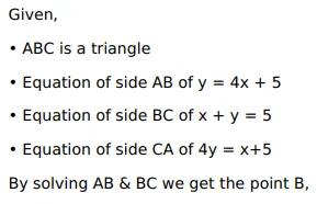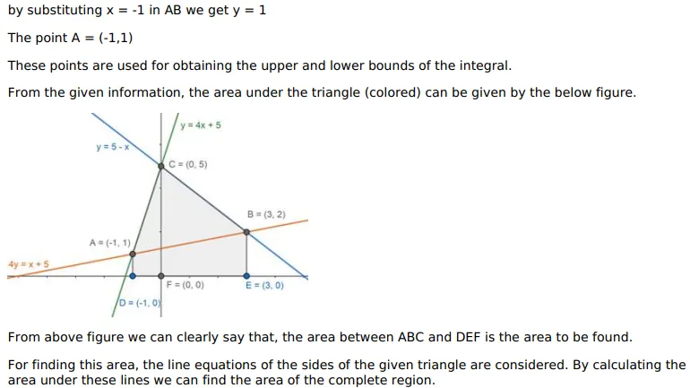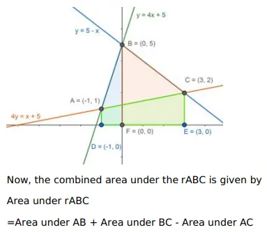 Using integration, find the area of $\triangle \mathrm{ABC}$, the equation of whose sides $A B, B C$ and $A C$ are given by $Y=4 x+5, x+y=5$ and $4 y=x+5$ respectively.