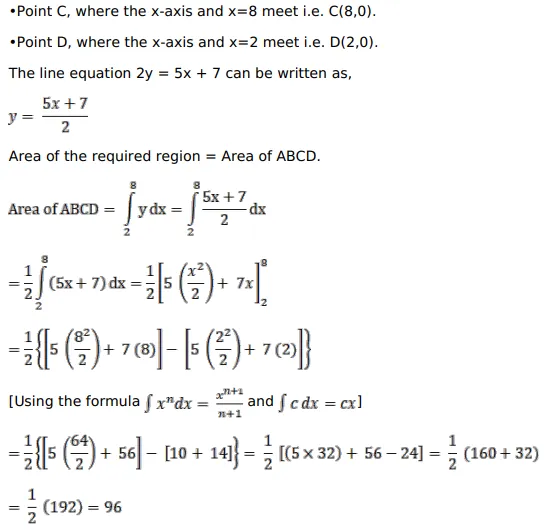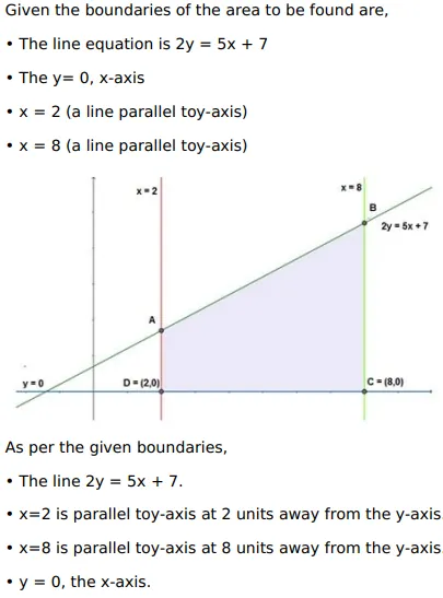 Using integration, find the area of the region bounded by the lines $2 y=5 x+7$, the $x$-axis and the lines $2 y=5 x+7$, the $x$-axis, and the lines $x=2$ and $x=8$.